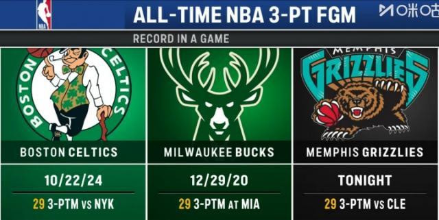 4月7日,NBA常规赛,灰熊主场126-142不敌骑士。灰熊此战三分球59投29中,追平了NBA历史单场三分球命中数纪录。2020年的雄鹿和2024年的凯尔特人都曾单场命中29记三分。